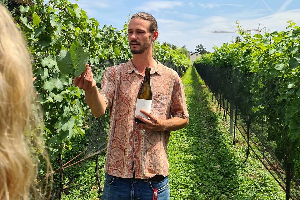 Excursion 2024: Wine Campus alumnus Brian Serr explains biological plant protection measures and uses a vine leaf to demonstrate typical infestation characteristics and their importance for wine quality in his vineyard.