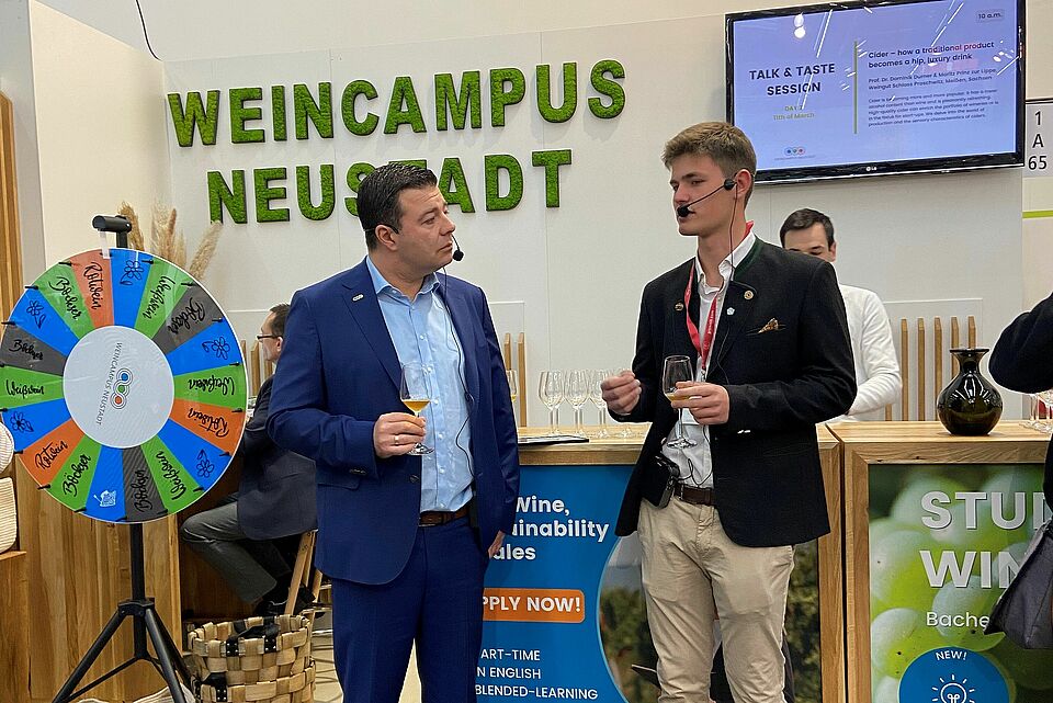 The Wine Campus at ProWein 2024 in Düsseldorf: Bachelor student Moritz Prinz zur Lippe from the Schloss Proschwitz winery in Meissen with Prof. Dr. Dominik Durner during a Talk & Taste session on the topic of cider.