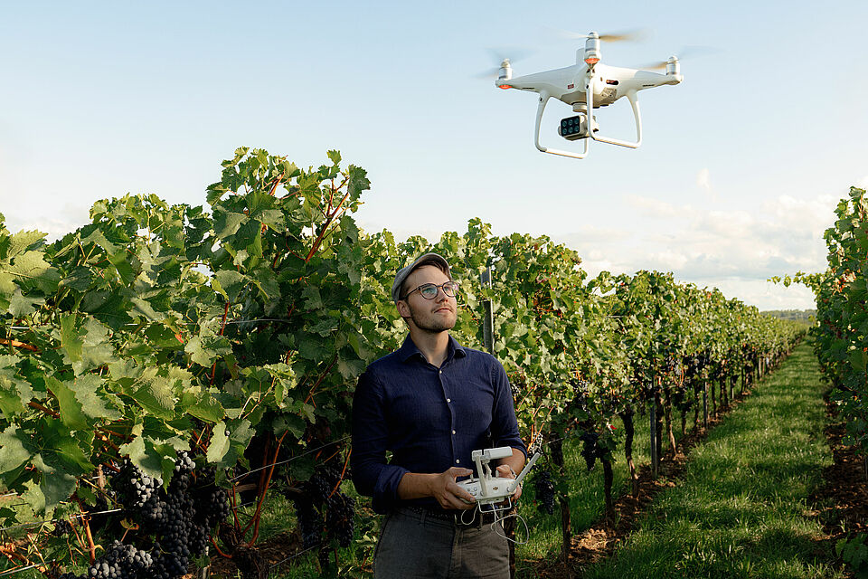 Lecturer Leonard Pfahl during a measurement of vitality data of the vines with a multispectral drone.