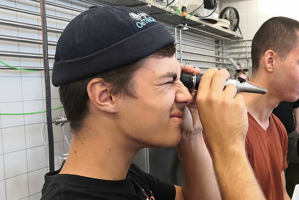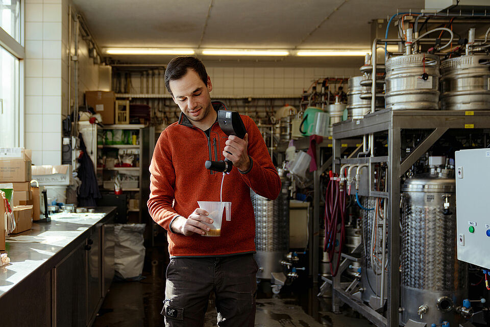 Student Vincent Stiburski checks the must weight of freshly harvested Solaris grapes as part of the oenology exercises in the prosemester.