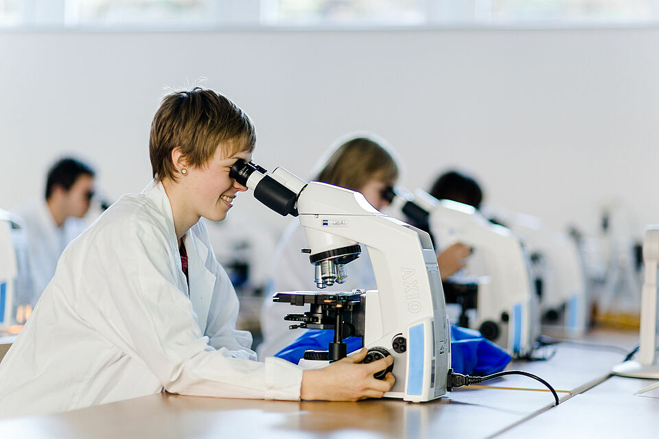 Student Madeleine Römer microscopes yeasts as part of the microbiology laboratory in the 3rd semester